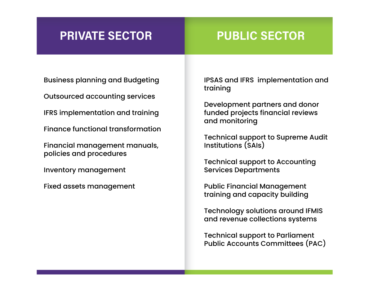 In the public sector, there has been an increased demand for financial management transparency, public participation and continued focus on budget execution and reporting. This coupled with the challenges in changing existing governance systems provides the need to work with highly professional and efficient team of experts.